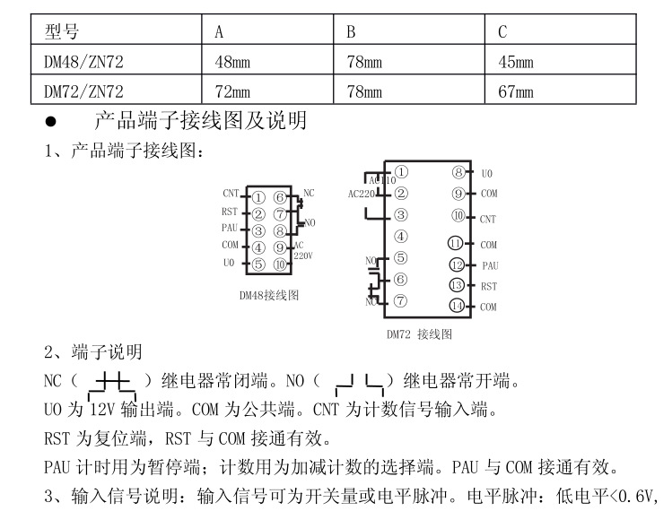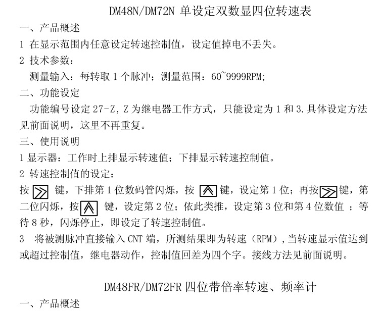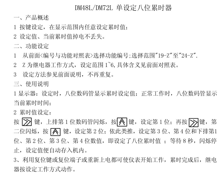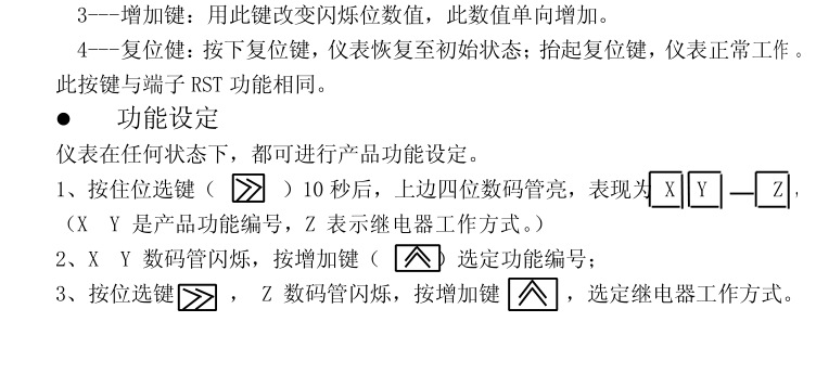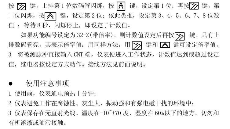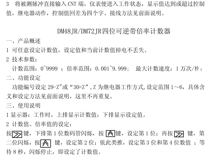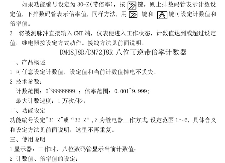 本產(chǎn)品采用進(jìn)口單片機(jī)編程,采樣精準(zhǔn),抗干擾強(qiáng),集合了多項功能于一體,可用作計數(shù)、計米、計時、累時、轉(zhuǎn)速、頻率等,細(xì)分功能達(dá)32種,5繼電器動作方式可選,開孔尺寸45*45mm,常規(guī)出貨220V,電源可以定制改為DC24V,適用范圍廣,操作簡單。